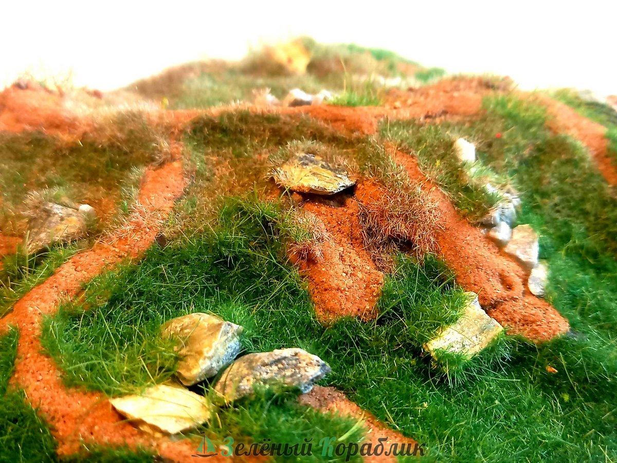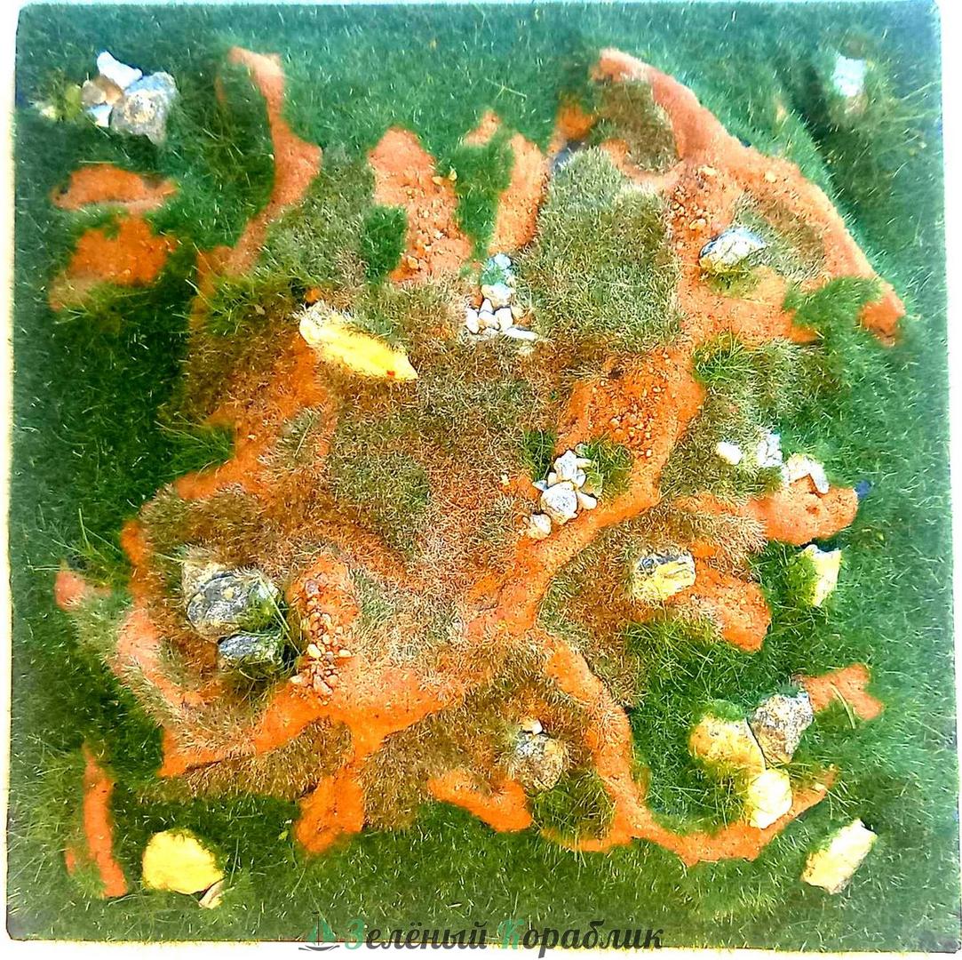 Виньетка на деревянной рамке для размещения моделей в масштабе 1:72, 1:100 и подобных. Материал: электростатический флок, песок, камень-змеевик, цветные присыпки. Модель на фото в масштабе 1:100 - для примера и в комплект не входит