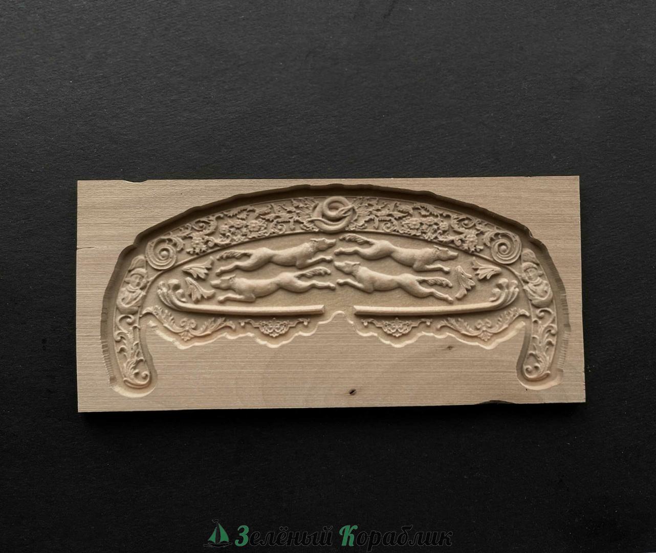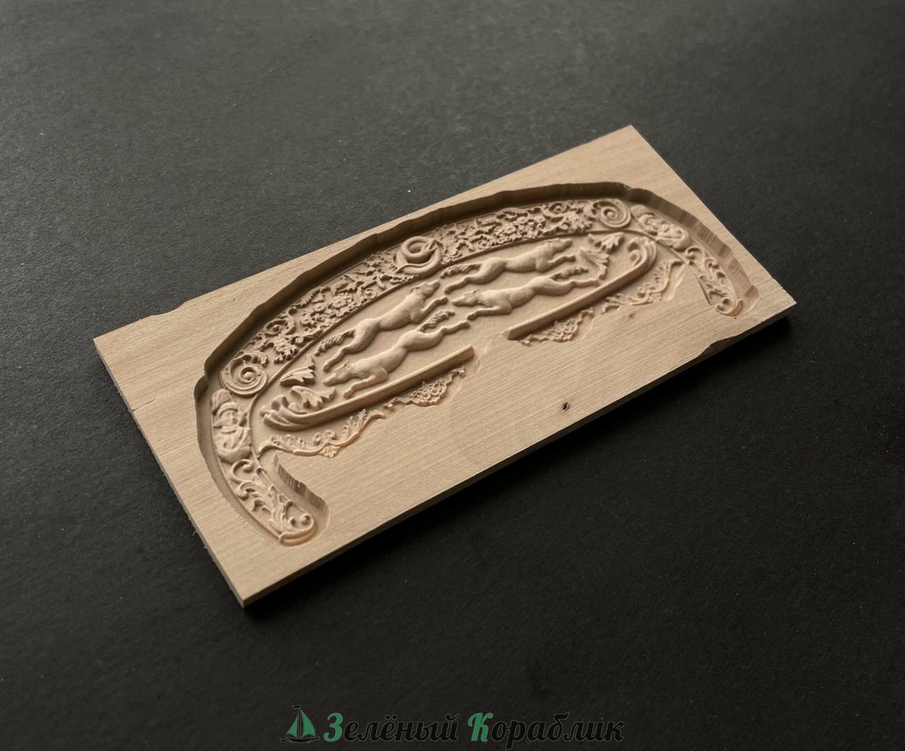 Декор для деревянной модели корабля в масштабе 1:50 ("Rattlesnake" и схожие по форме кормы). Изготовлен из древесины груши с высокой точностью на станке с ЧПУ. Легко отделяется от основания модельным ножом.